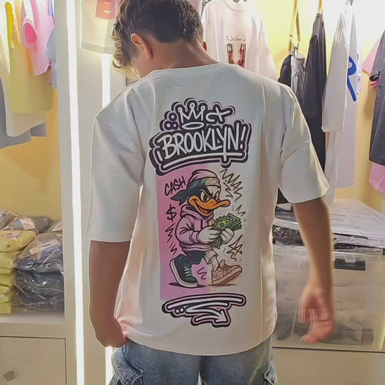 Designed in a washed grey shade, this tee features a graffiti-style graphic on the back with a streetwise cartoon duck stacking cash and repping Brooklyn pride. The oversized fit brings extra attitude, making it a standout piece for kids who like their streetwear playful, loud, and full of swagger.